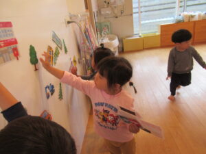 遠足ごっこ当日は雨だったのでお部屋の中にみんなで街作りをして過ごしました。