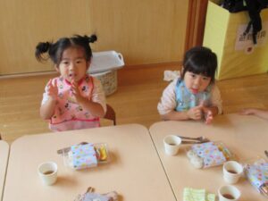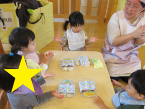 沢山身体を動かした後はずっと楽しみにしていたお弁当タイム♬みんなの大好きな唐揚げが入っていて思わず「うわぁ~♡」と幸せたっぷりでした!人気メニューの唐揚げとブロッコリーサラダだった為すぐに食べ終わりました。ぴっかりんになったお弁当箱を見て「全部おいしかった~」と幸せたっぷりでした♬