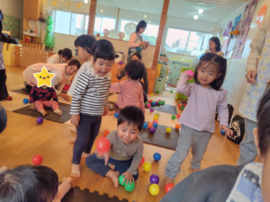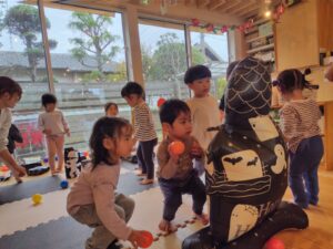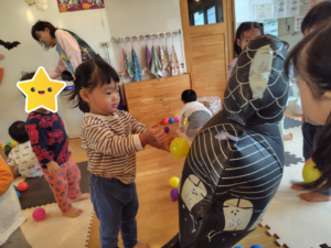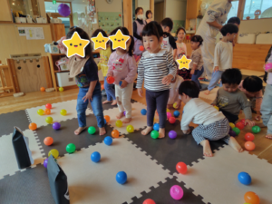 パネルシアターは怖がっちゃう子もいたので、気分を変えてボール投げ!