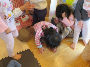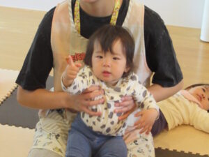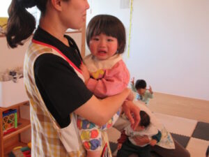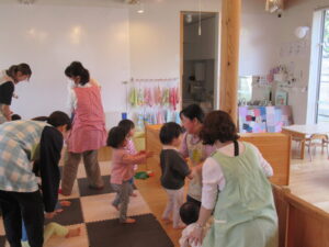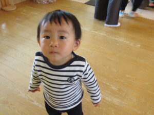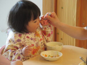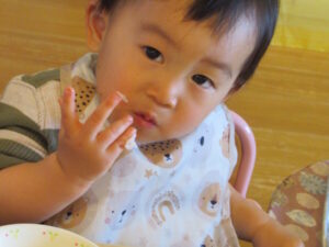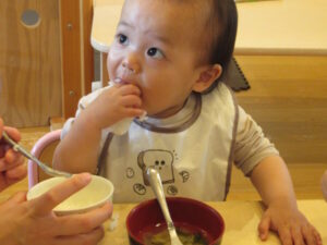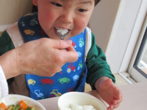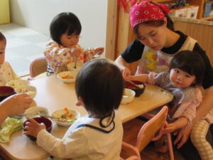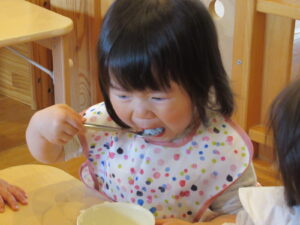 りす組さんは給食が始まりました。給食、モグモグ。美味しいね。